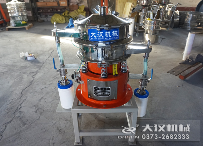 氣體保護(hù)篩分機(jī)是直徑600mm型號(hào),一層兩個(gè)出料口,再原有圓形篩分機(jī)的基礎(chǔ)上加裝氣體保護(hù)裝置,與物料接觸部分是304材質(zhì),采用立式振動(dòng)電機(jī)作為激振源,電機(jī)上、下兩端安裝有偏心重錘,將電機(jī)的旋轉(zhuǎn)運(yùn)動(dòng)轉(zhuǎn)變?yōu)樗?、垂直、傾斜的三次元運(yùn)動(dòng),再把這個(gè)運(yùn)動(dòng)傳遞給篩面。