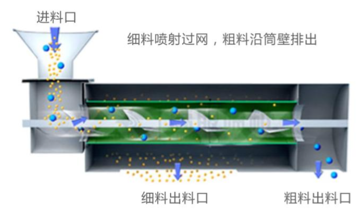 WQS氣旋篩由于形狀為橫臥狀所以也叫臥式氣流篩或臥式氣流篩分機 ,網為圓筒狀,置于機體內,物料通過螺旋輸送系統后,和氣流混合、霧化進入網筒內;通過網筒內風輪葉片使物料同時受離心力和旋風推進力,從而近使物料噴射過網,由細料排出口排出,不能過網的物料沿網筒壁從粗料排出口排出。